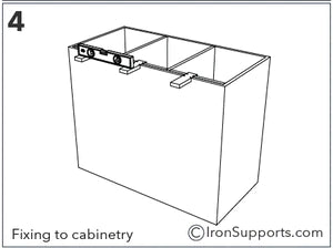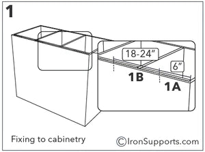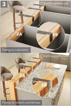 3. 3A. IMPORTANT NOTE: You must make sure you are securing these brackets to a stable surface suitable for supporting the weight that will be applied. If securing to cabinetry, It is highly recommended that these brackets are secured to a 2x4 or 2x6 stud or a header. Blocking behind your cabinet carcases is a must.